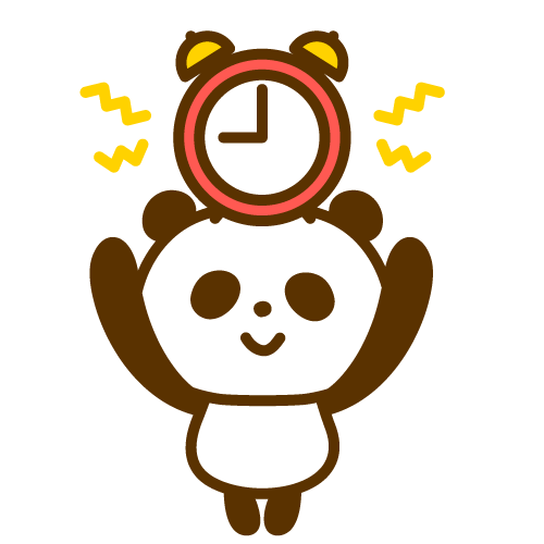 目覚まし時計を持って時間をお知らせするパンダの無料イラストです。タイムセールや期間限定、早寝早起き、時間厳守そんなシーンの挿絵イラストにご利用ください。目覚まし時計単品のイラストもあります。