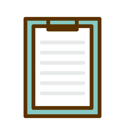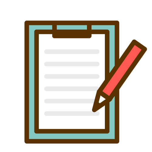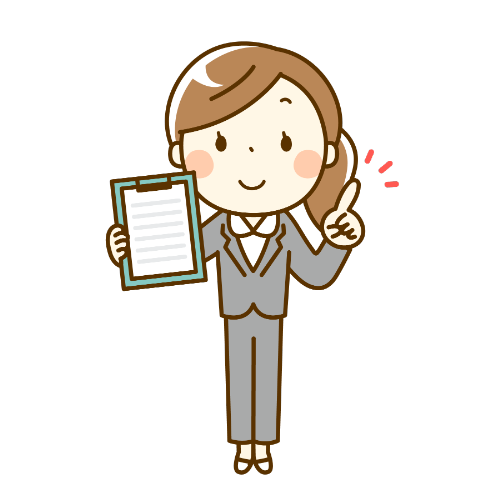 書類を挟んだバインダーを手に持ったスーツ姿の女性のイラストです。アンケートや書類記入、資料の提出のお願いの場面にご利用ください。バインダーと鉛筆のアイコンもご一緒に。
